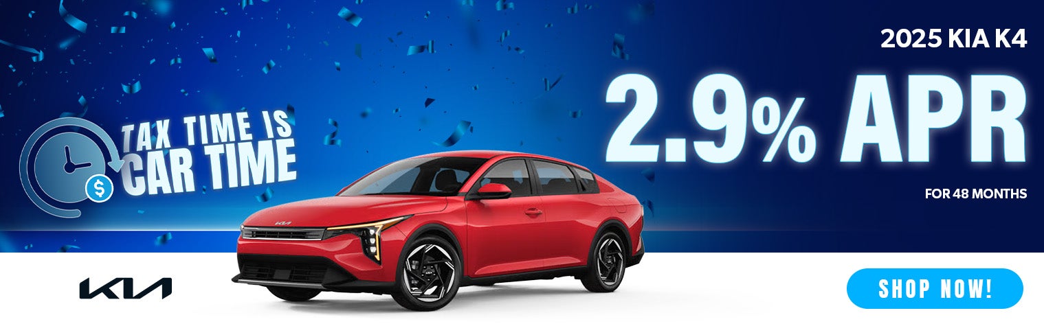 2.90% APR up to 48 months. 2.90% Annual Percentage Rate (APR) up to 48 months. $22.09 per month per $1,000 financed at 48 months. APR financing subject to credit approval by Kia Finance America (KFA), through KFA, for well-qualified buyers and not available on balloon financing. Only a limited number of customers will qualify for advertised APR. Subject to vehicle availability and dealer participation. New vehicles only. This incentive is a limited-time offer on eligible Kia vehicles. Offers may not be combined except where specified. Must take delivery from a participating dealer and from retail stock by 03/02/2026. Dealer contribution may vary and could affect actual monthly payment. See your participating Kia dealer for more details. Finance contract must be signed and dated no later than 03/02/2026. Limited inventory available.